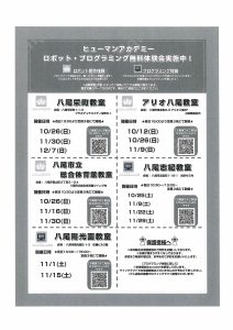 2025.10.15 お知らせ こどもプログラミング秋季体験会開催! ◉現在、当教室のプログラミング授業は ベーシック、ベーシック2、ミドル、ミドル2の4コース 土曜・水曜の2曜日・3ワク設定。 ✳︎プログラミング教室は、いつから始めても大丈夫なカリキュラムになっています。 *プログラミング詳細はヒューマンアカデミーのホームページ:コチラをご覧ください。 ◉体験会は 各1時間 各定員3名 10/25(土)・11/8(土)・11/22(土)・11/29(土) 各日10 :30〜 / 13:00〜 ぜひ一度チャレンジに来てください。 体験会のご予約はコチラから